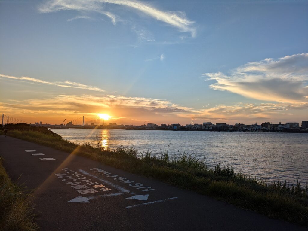 ホテルの目の前は、多摩川の河川敷なので、夕方に散歩をするときれいな夕日を見ることができます。