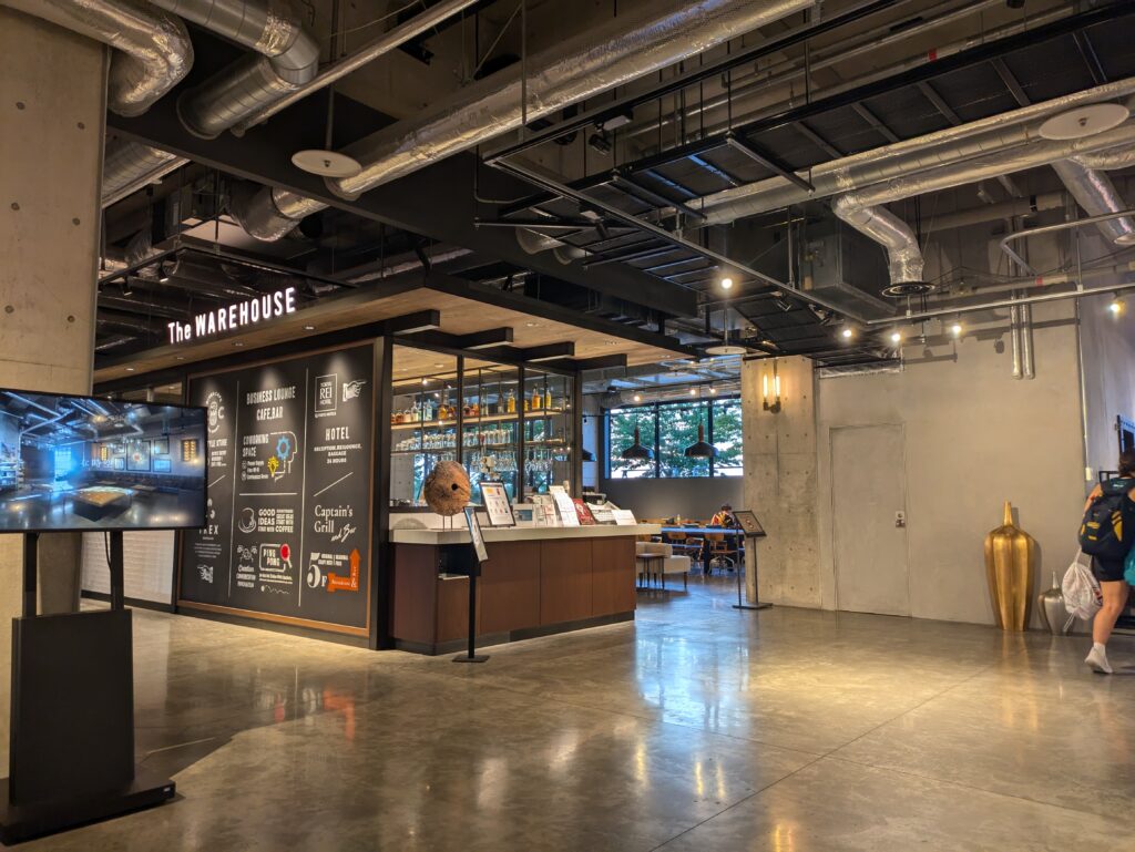 上の写真は、ロビーにあるビジネスラウンジ&カフェの『THE WAREHOUSE』です。11:00~20:00まで営業しており、軽食やコーヒー、アルコールも販売しています。コーヒータイムを満喫したり、お酒を楽しんだりと様々なスタイルで使うことができます。
