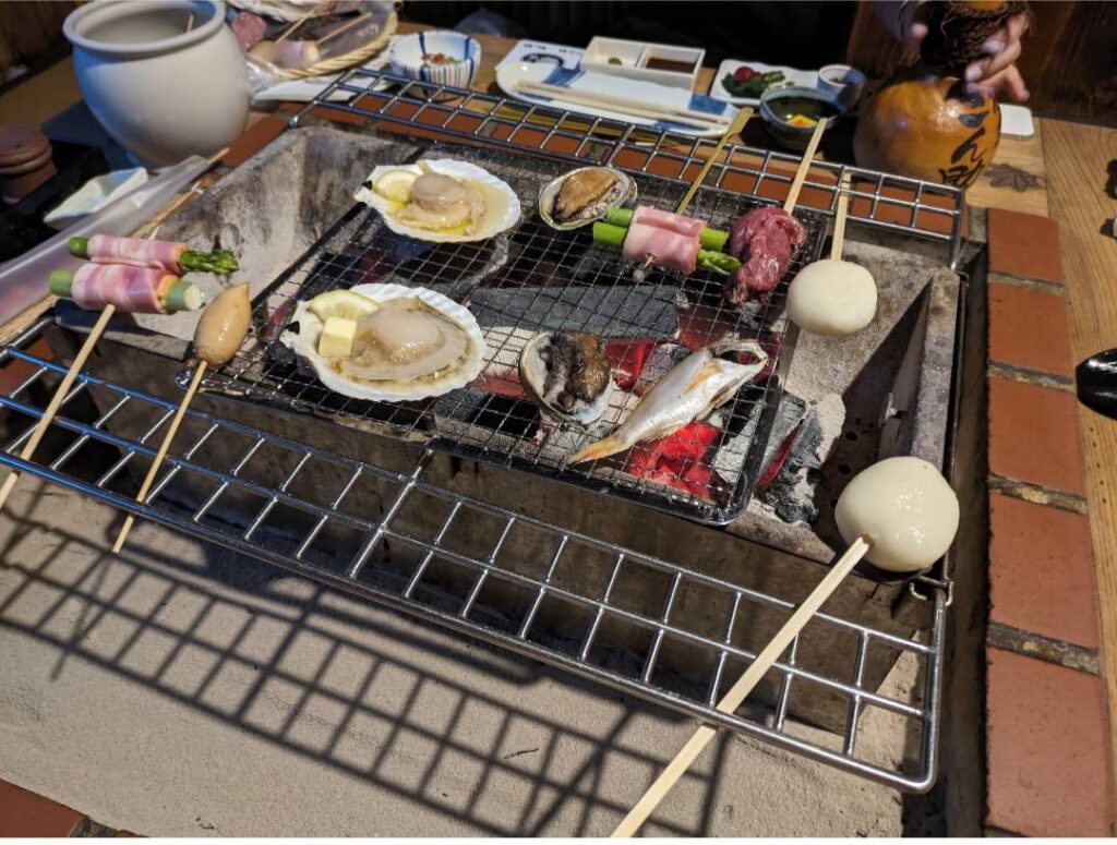ウィンナーやベーコン巻きアスパラ、ししゃも、お肉、貝など様々なものを囲炉裏で焼いて楽しむことができます。