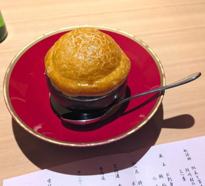 上の写真は、パイシチューです。周りのパイはさくさくです。スプーンでパイに穴をあけると中にはとろとろのシチューが。