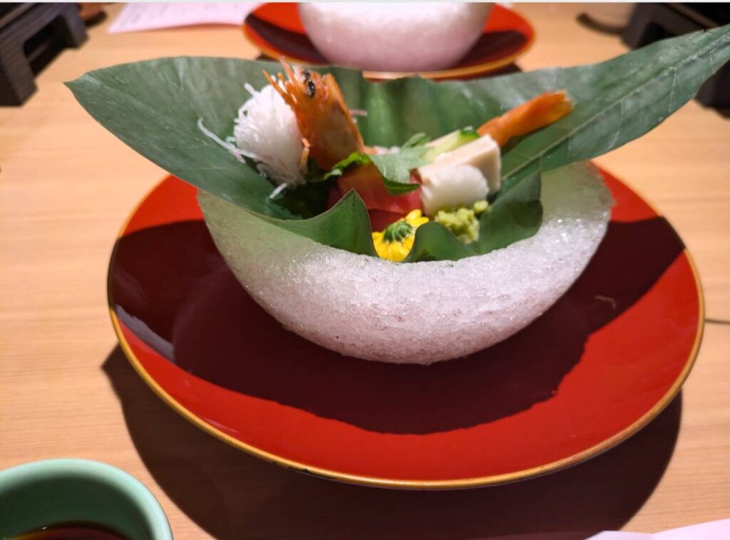上の写真はお刺身。新鮮な刺身はこれまたとってもおいしい。そして、氷の器に入っているお刺身。やっぱりこちらも目でも楽しめる一品。