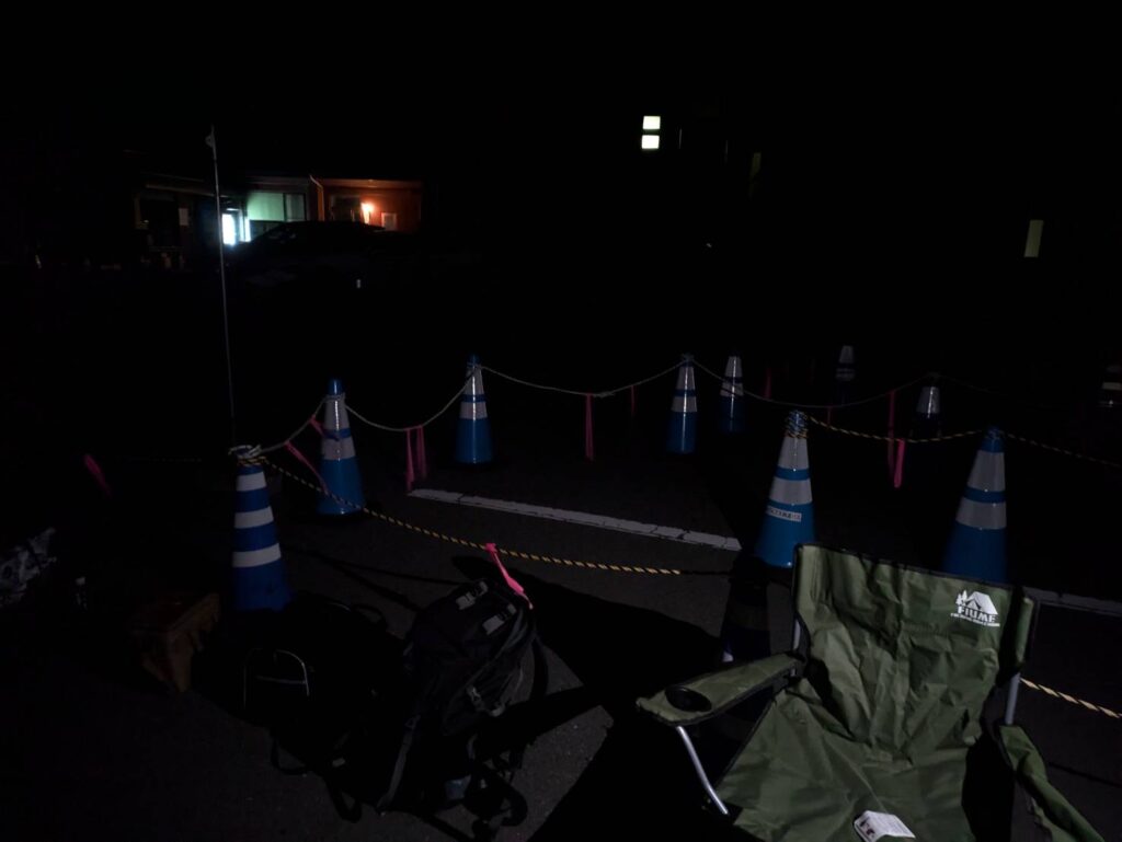 こんなに暗いのに、結構な人が並んでいますよね。椅子などをもっていくことをおすすめします。